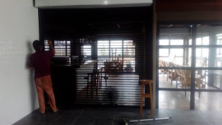 contoh pemasangan rolling door full ferforeted cafe rumah kayu